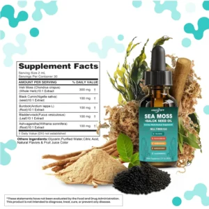 - Sea Moss Supplement Total Nutrition Powerhouse: Organic seamoss liquid drops have emerged as a powerhouse, offering an impressive array of health benefits. Known for their rich nutrient profile, these drops support various aspects of health, from immune function to overall wellness, promoting healthy skin and hair, and providing potent antioxidant properties. When combined with black seed oil, sea moss liquid drops become an essential addition to anyone’s wellness regimen.